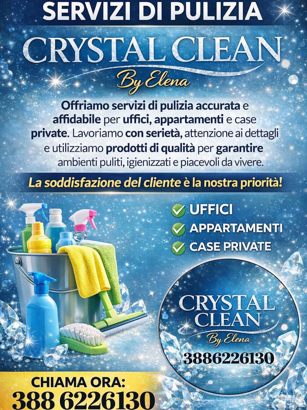 A Crystal clean by elena,ci impegniamo a fornire un servizio di pulizia superiore, personalizzato per soddisfare le vostre esigenze specifiche. Offriamo comfort e perfezione in ogni dettaglio.